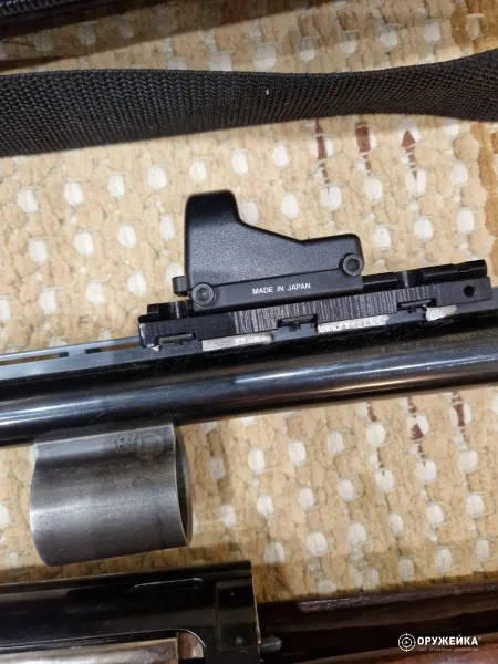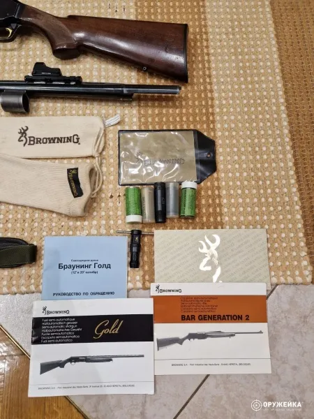 Гладкоствольное полуавтоматическое ружьё BROWNING GOLD калибр 12/76, магазин 4+1, дерево орех, сменные Д/Н (4 стандартных и одно удлиненное), ключ, чехол для ствола. Состояние хорошее. Последняя охота в 2015. Один владелец. На ружье установлен японский каллиматорский прицел BED-40.