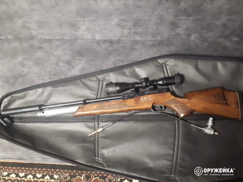 Оформление обязательно согласно закону РФ. Полный комплект: 1.0птика 2.Дозаправочный шланг. 3.Баллон кислородный. Пневматическая винтовка Weihrauch HW 100 T PCP считается жемчужиной конструирования пневматического оружия. Высокая точность стрельбы, мощность и большой запас выстрелов, а также система быстрой заправки делают это оружие необычайно востребованным на российском рынке пневматики.