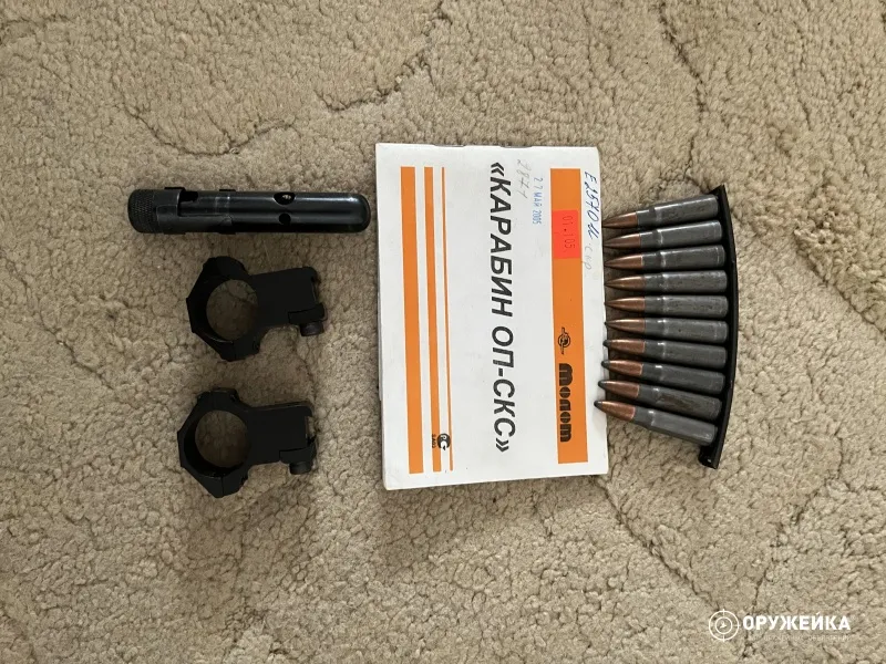 Карабин ОП СКС 7,62х39 в хорошем состоянии с минимальным настрелялом, не более 20 выстрелов 1954 г в в комплекте с быстросъёмный прицелом SIMMONS. Небольшие дефекты на прикладе остались от магазина продаж. Без лицензии просьба не беспокоить! Продажа через разрешительный отдел в Москве.