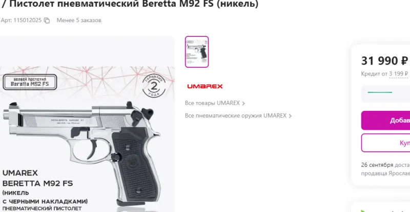 Продам Beretta M92 FS Б/У заряд на 8 пуль, калибр 4.5, производство Германия,