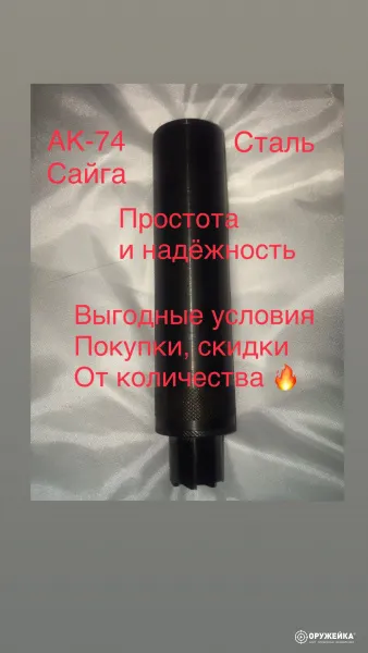 Ссылка на страницу заказа: https://ozon.ru/t/GcVD31T Разборный ДТК на АК-74 -5.45. и его модификации. Карабин (сайга МК) предназначен для снижения звука выстрела (не травмирует слух стрелка) снижения отдачи и вспышки, до пределов разрешенных законом об оружии. При использовании на автомате АК рекомендуется наносить на резьбу разово смазку графитовую, съём со ствола будет всегда легкий. ЕСТЬ заказ с рассрочкой через ОЗОН. Характеристики; Пламегаситель (сепаратор) материал Сталь Резьба крепления на ствол 24х1.5 -оснащена храповиком под штатный подпружиненный штифт мушки. Вес - 427 гр Длина -170 мм Диаметр 41 мм 7 камер Соосность 100% пулепроходное отверстие 9мм Не деформируется в режиме автомат, цвет выдерживает перегрев и остается прежним. Покрытие - химическое оксидирование черным цветом. Корпус разборный, обслуживаемый. Отстрел испытуемой модели на сегодня - 3700 выстрелов из АК 74. Для карабина ДТК -вечный.