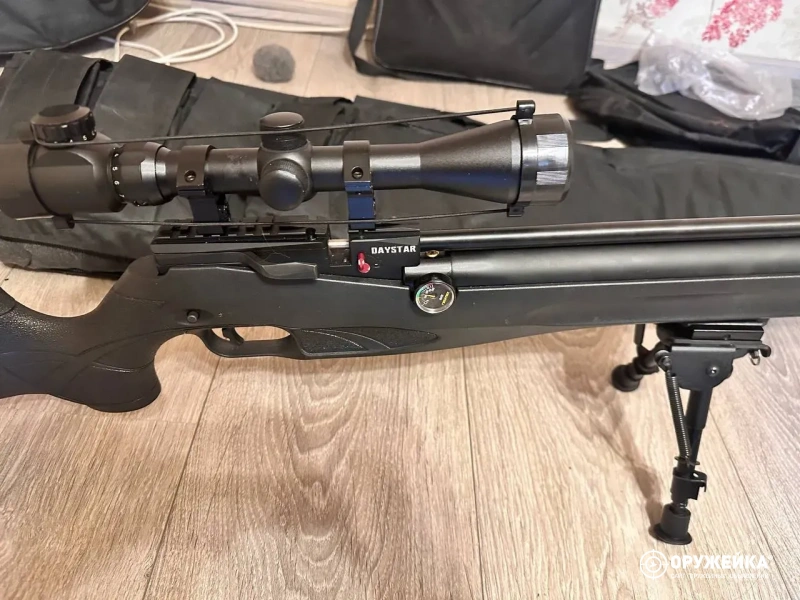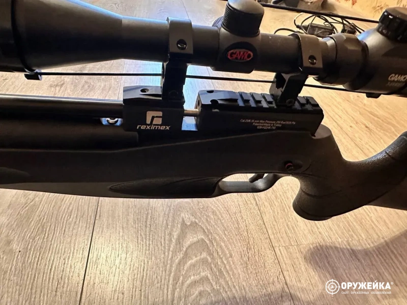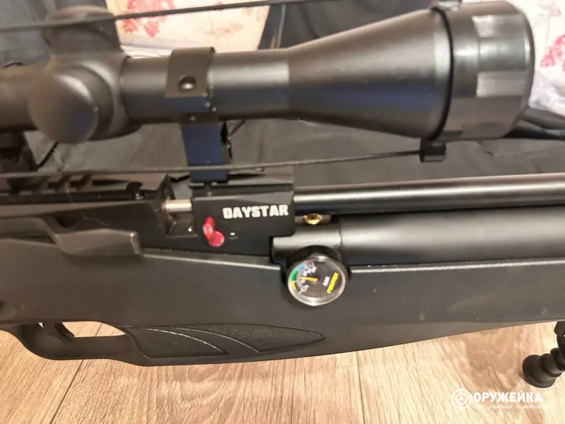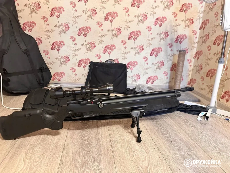 Установлен прицел Gamo с трехкратным увеличением, есть встроенная тринога, цехол, насос для винтовки, коробка, все документы и коробки патронов под неё.